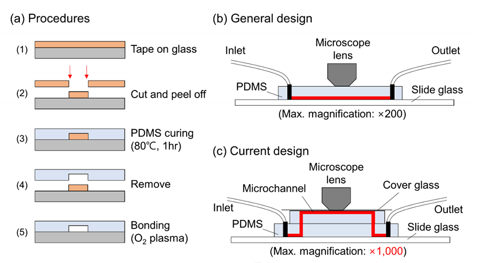 图1.使用PDMS创建微通道的制备步骤(a)。微流体装置的一般设计和当前设计的示意图比较(b和c)。