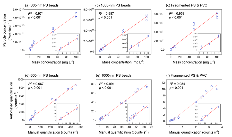图4.相关性分析显示了自动定量获得的粒子浓度与亚微米级MP的质量浓度之间的关系(a、b和c),以及亚微米级MP的自动定量和手动定量结果之间的关系(d、e和f)。插图提供了0.1至10mg/L质量浓度结果的放大视图(a、b和c),以及以下范围内的手动定量浓度:(d)4.4至167.2,(e)0.4至11.6,以及(f)0至1.1counts/s。