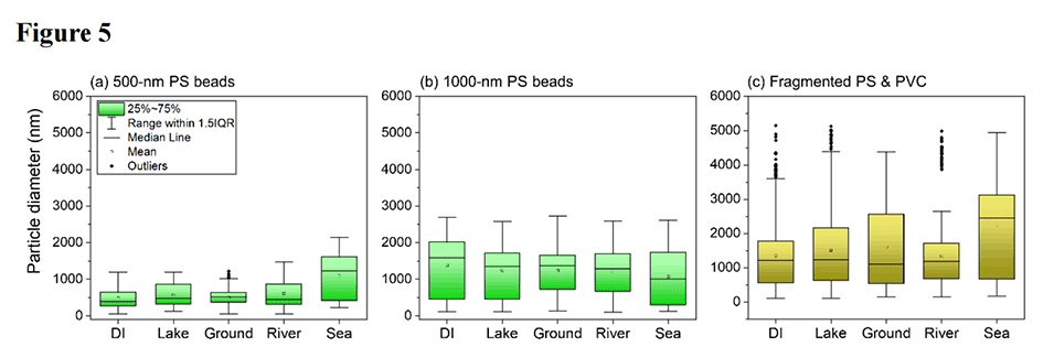 图5.箱线图描绘了分散在去离子水(DI)、湖泊、地面、河流和海水中的(a)500nm PS珠、(b)1000nm PS珠和(c)破碎亚微米级MP的粒径。该图是在1.5倍四分位数间距(IQR)的范围内使用晶须模型绘制的。