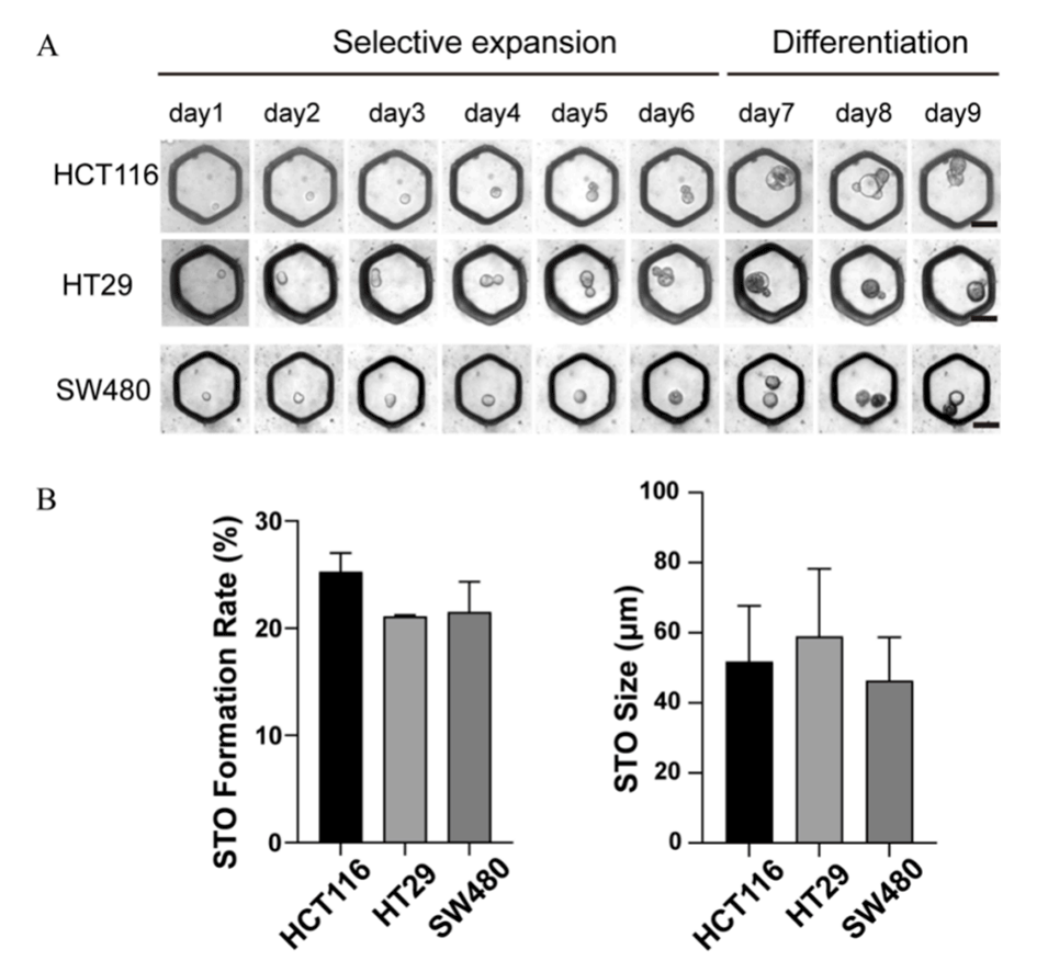 图3.(A)经过6天的单细胞培养后,TSC球体形成,随后经过3天的差异诱导,发育成STO。比例尺:50μm。(B)来源于各种类型的结肠癌癌细胞的STO的形成速率和大小。