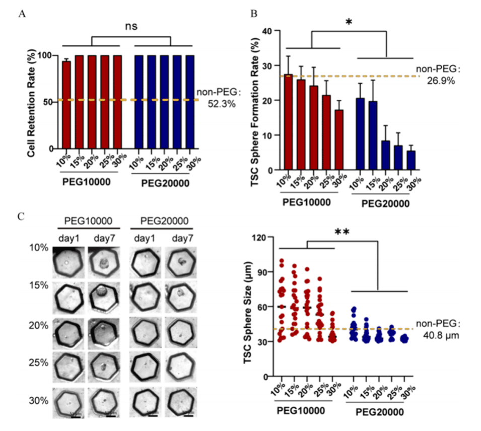 图2.在不同浓度的PEG存在下,连续单细胞培养中的细胞保留和TSC球体形成。