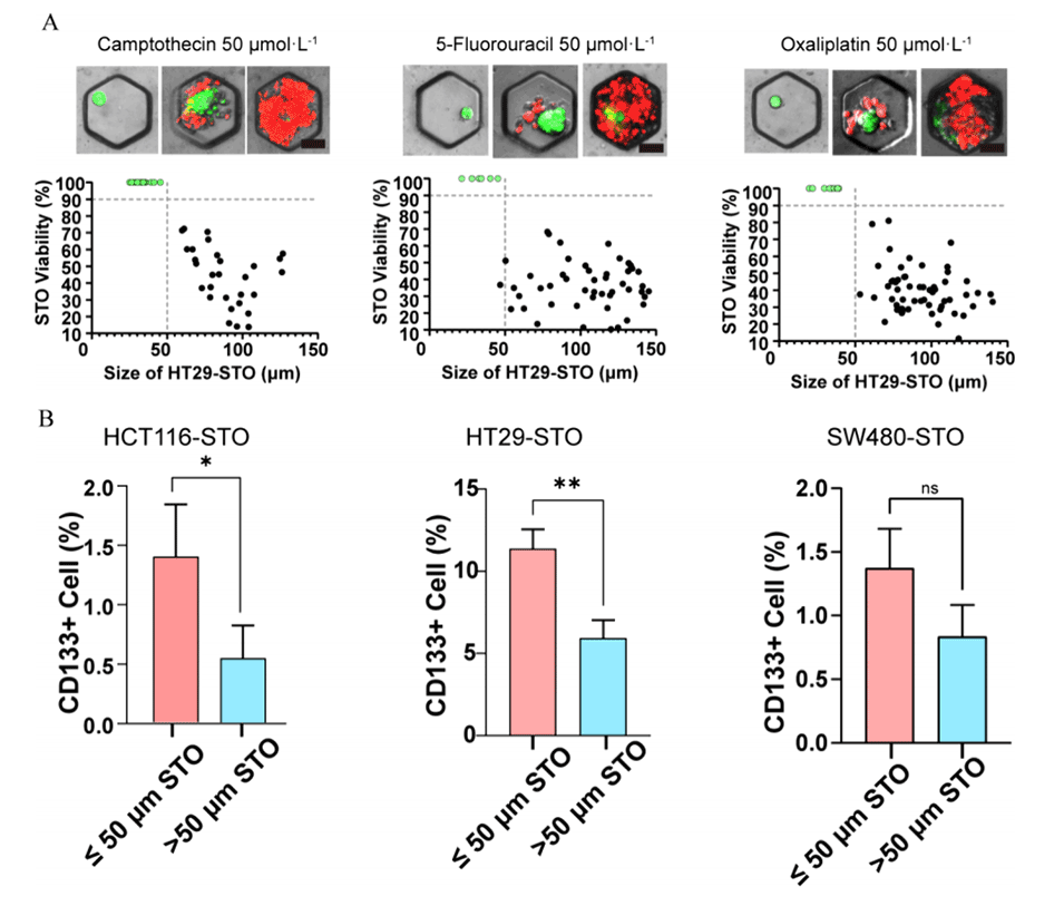 图6.(A)用药物组合(CPT 50μmol/L、5-Fu 50μmol/L和OX 50μmol/L)处理HT29-STO 48小时后,使用钙黄绿素AM/PI染色测定单个STO内细胞的存活率(上图)。比例尺:50μm。散点图(绿色部分表示高度存活的STO)显示了存活率与STO大小的相关性(下图)。(B)流式细胞术结果显示,CD133在小尺寸和大尺寸STO的细胞中的表达(n=3)。