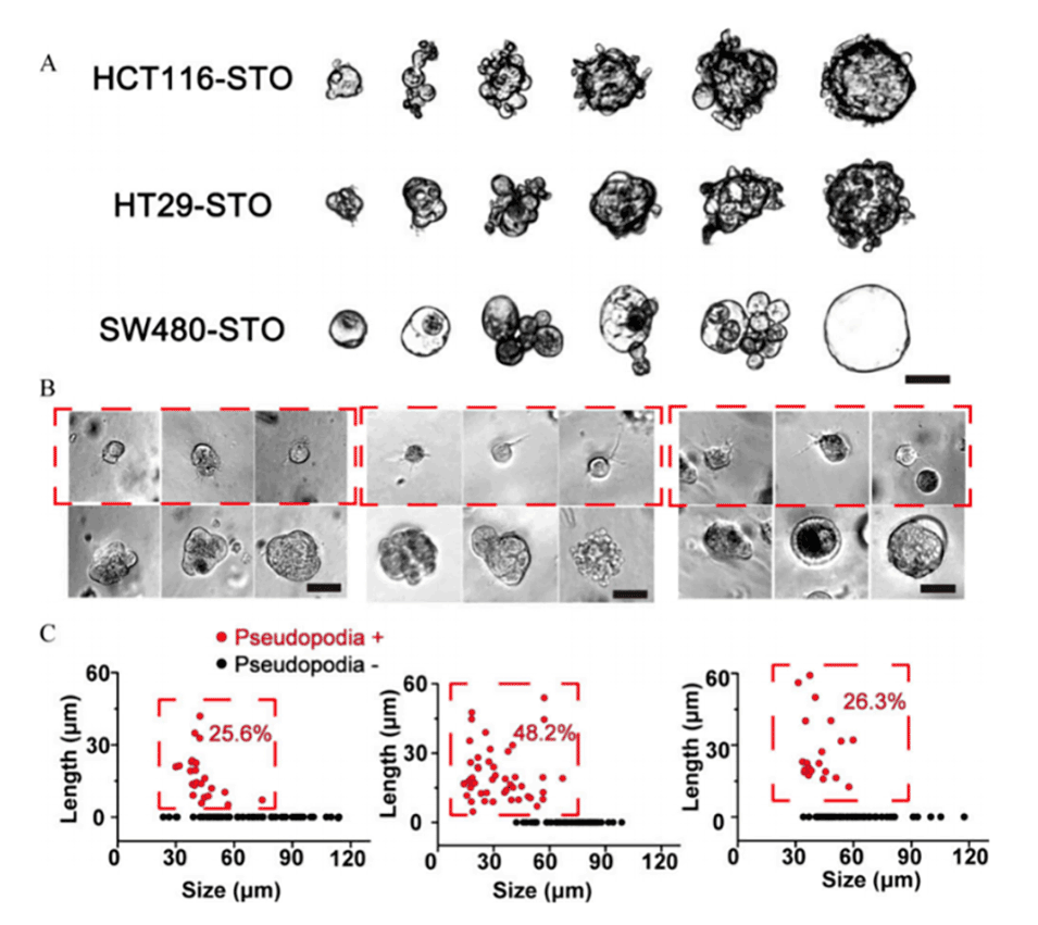 图5.(A)单个STO之间的形态差异。比例尺:50μm。(B)在Matrigel中培养2天后,STO中侵袭性伪足的发育情况。比例尺:50μm。(C)不同大小的STO中侵袭性伪足的发育情况。
