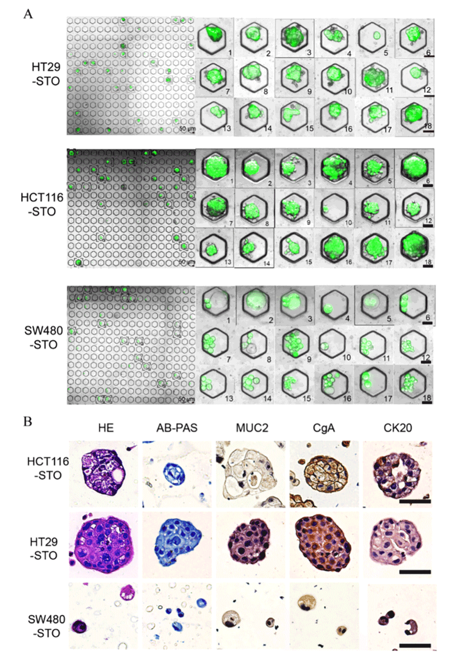 图4.(A)钙黄绿素AM/PI染色显示所得STO的活力。比例尺:50μm。(B)HE染色显示各种STO内的腺体结构。AB-PAS染色显示STO内的中性粘蛋白(红色/紫色)和酸性粘蛋白(蓝色)。免疫组织化学染色显示STO内细胞中MUC2、CgA和CK20的表达。比例尺:50μm。