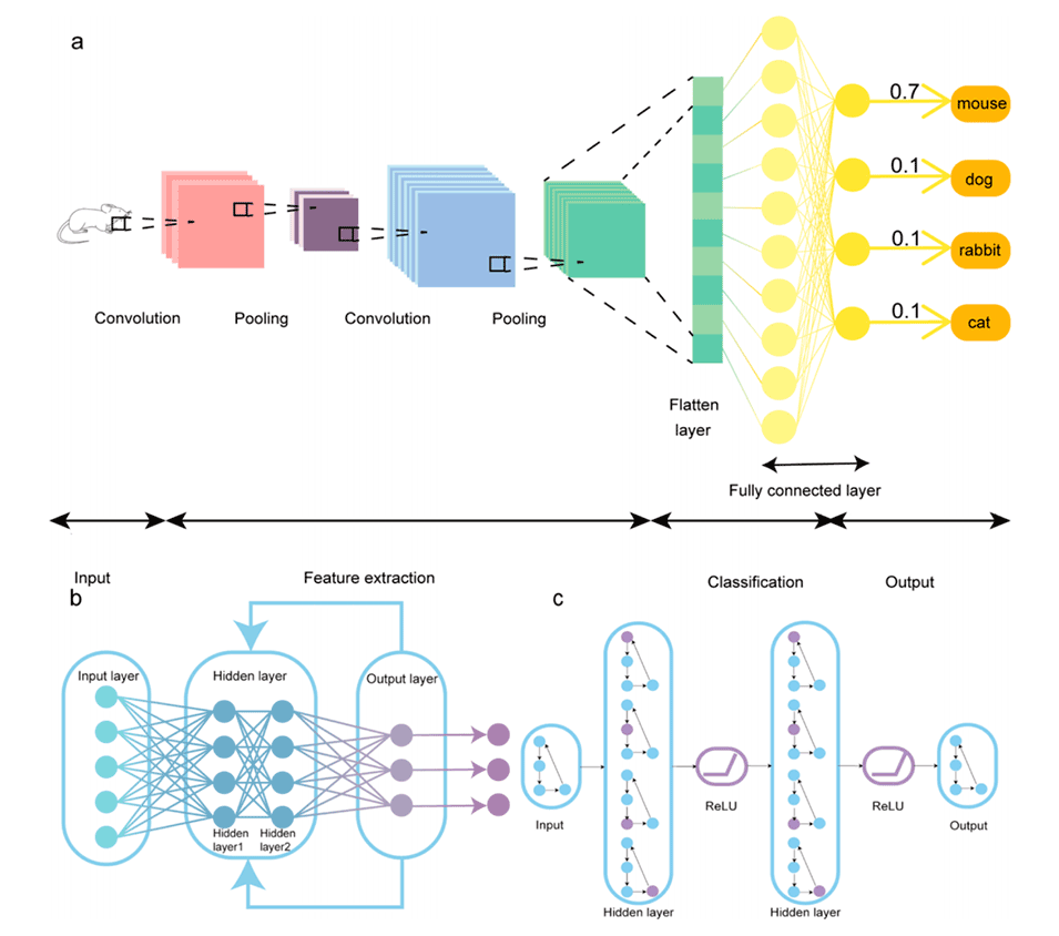 图2.一些典型的机器学习模型。(a)卷积神经网络(CNN)结构。(b)递归神经网络(RNN)结构。(c)图神经网络(GNN)结构。