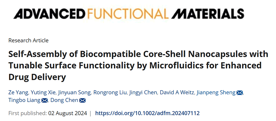 近期,浙江大学陈东研究员、梁廷波教授团队提出了一种通过微流控技术单步制备具有可调表面功能的生物相容性核壳纳米胶囊的方法,以提高药物递送的效率和靶向性。相关研究以“Self‐Assembly of Biocompatible Core‐Shell Nanocapsules with Tunable Surface Functionality by Microfluidics for Enhanced Drug Delivery”为题目,发表在期刊《Advanced Functional Materials》上。