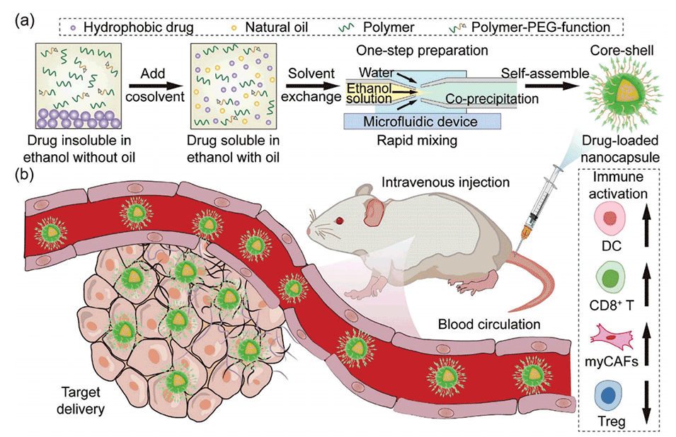 图2.在微流体通道中快速混合后,自组装形成具有可调表面功能的生物相容性核壳纳米胶囊。