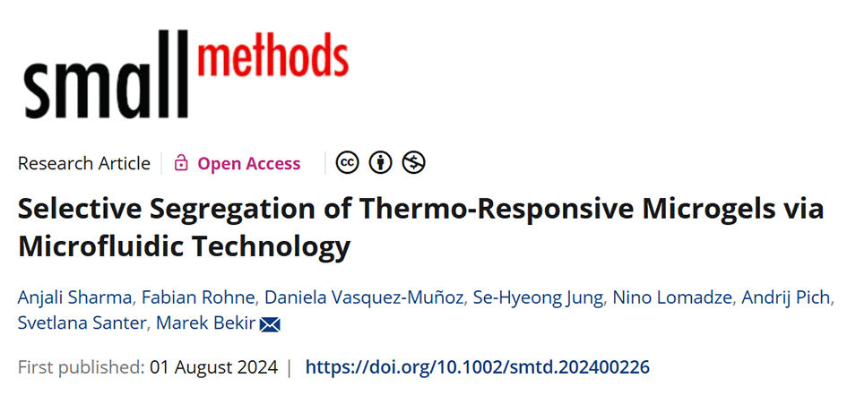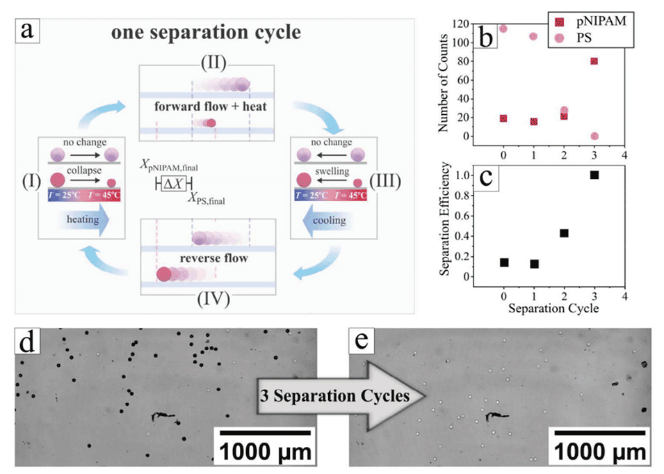 近期,有研究人员设计了一种创新的分离技术,该技术通过利用温敏性微凝胶在加热时的体积相变行为,并结合微流控技术,以一种简单而有效的方式分离具有不同电荷特性的微凝胶。相关研究以“Selective Segregation of Thermo‐Responsive Microgels via Microfluidic Technology”为题目发表于期刊《Small Methods》。