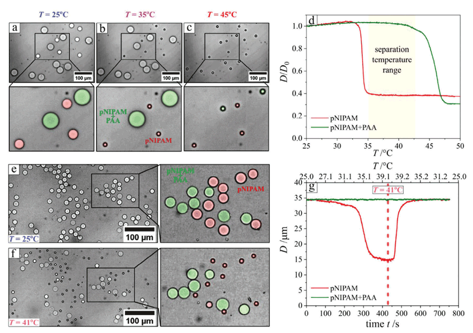 图1:展示了在不同温度下,由纯pNIPAM(红色,较小直径)和带电的pNIPAM-PAA(绿色,较大直径)组成的混合微凝胶的光学显微照片。a)25℃时,所有微凝胶都处于膨胀状态;b)35℃时,pNIPAM微凝胶开始塌陷,而pNIPAM-PAA微凝胶仍处于膨胀状态;c)45℃时,pNIPAM-PAA微凝胶也开始塌陷。d)显示了不同带电微凝胶的归一化直径D/D0随温度变化的函数关系。e)和f)分别在25℃和41℃下,pNIPAM和pNIPAM-PAA微凝胶的光学显微照片,其中pNIPAM用红色叠加,pNIPAM-PAA用绿色叠加。g)微凝胶的平均直径随时间和温度的变化。
