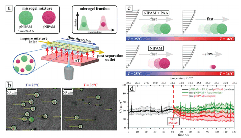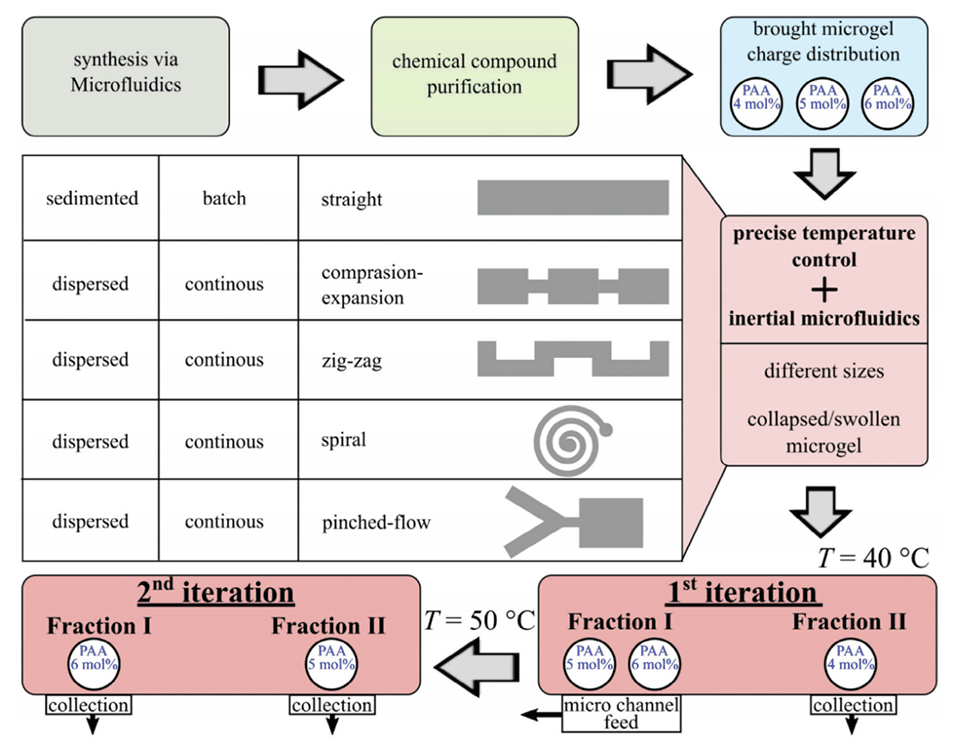 图8:展示了嵌入不同含量PAA的热响应微凝胶(微米范围,1-100微米)纯化的指导原则。首先通过油滴形成的方法合成微凝胶,并通过后续步骤从未反应的单体和不需要的分子杂质中纯化微凝胶。采用惯性微流控策略对分散在PAA分布较广的水表面活性剂溶液中的纯化微凝胶进行进一步纯化。在不同溶剂温度的其他双重迭代中实现纯化:低于和高于不需要的PAA分布的VPTT。