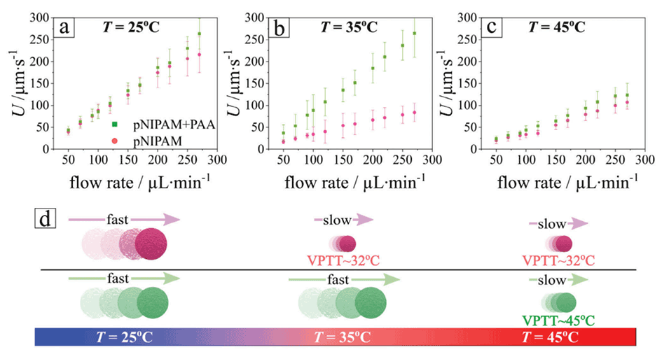 图4:展示了在25℃、35℃和45℃不同温度下,pNIPAM和pNIPAM-PAA微凝胶的平均速度与流速的关系。当两种微凝胶尺寸接近时,无论是完全膨胀还是完全塌陷,它们的速度差异可以忽略不计,难以实现有效分离。但是当尺寸明显不同时,速度差异显著,能够实现有效分离。