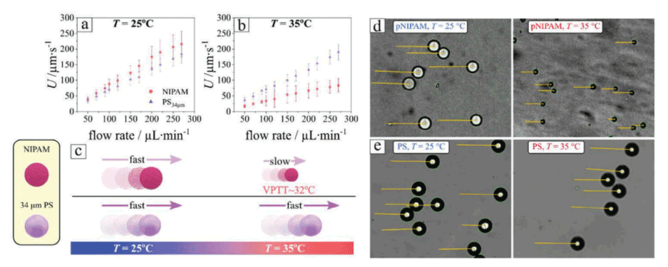图5:展示了在25℃和35℃下,尺寸相同的pNIPAM(膨胀状态下,低于VPTT)和聚苯乙烯(PS)微粒的平均速度随流速的变化。尽管pNIPAM和PS的尺寸相同,但由于它们的密度不同,这两者的分离是可能实现的。