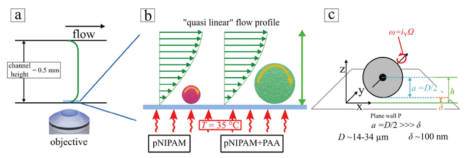图3:a)展示了微流控通道的横截面和流动剖面图。b)展示了塌陷的pNIPAM和膨胀的pNIPAM-PAA微凝胶所经历的“准线性”剪切应力的示意图。c)展示了微凝胶在剪切力作用下沿流动方向的角速度ω,以及由此产生的平移粒子速度U的计算。