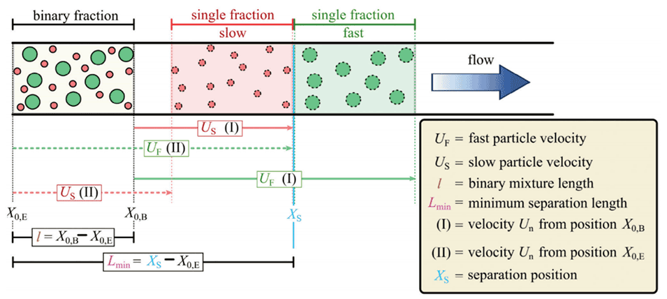 图6:展示了在矩形通道内流动的二元胶体混合物的分离过程示意图。