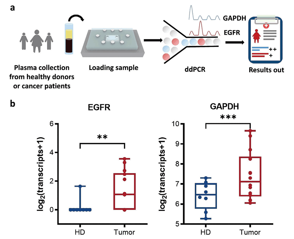 图6.a)使用来自健康捐赠者和癌症患者的血浆样本测试芯片性能的工作流程。b)箱形图显示ddPCR用于分析检测到的癌症患者(n=14)和健康供体样本(n=8)的总EGFR和GAPDH转录拷贝数。箱形图通过触须(whiskers)展示了数据的最小值到最大值的范围,箱体表示了数据的中间50%的分布区间,中间的横线代表数据的中位数。使用Wilcoxon检验评估不同组之间的显著差异(**p<0.01,***p<0.001)。