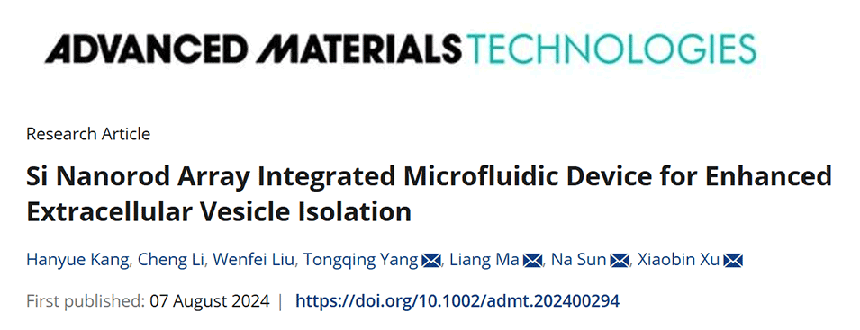 肿瘤细胞释放的细胞外囊泡(EV)已成为早期癌症诊断的重要标志物之一。然而,从复杂的体液环境中高效收集EV仍是一大挑战。近期,同济大学杨同青教授、许晓斌教授团队联合浙江大学马梁副教授团队开发了一种集成硅纳米棒阵列的微流控芯片,能够高效分离肿瘤细胞释放的EV,并通过定量分析EV中的生物标志物实现了对不同类型癌症患者的早期诊断。相关研究以“Si Nanorod Array Integrated Microfluidic Device for Enhanced Extracellular Vesicle Isolation”为题目,发表在期刊《Advanced Materials Technologies》上。