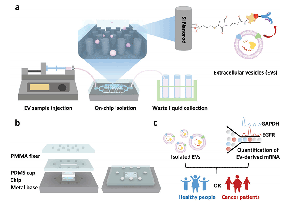 图1.a)纳米棒芯片进行EV免疫亲和分离的工作机制示意图。b)微流控芯片装置的结构及螺钉组装示意图。c)通过该芯片分离出人血浆样本中的EV,并进行液滴数字PCR(ddPCR),以获得用于癌症检测的特定基因签名。