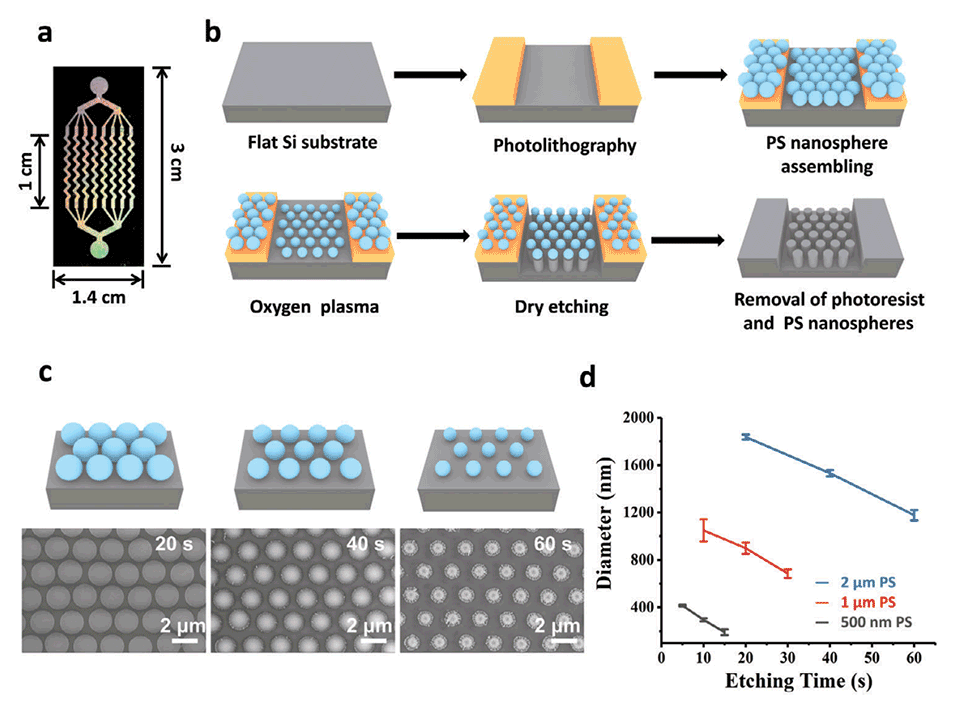 图2.a)暗室照明下拍摄的芯片照片。b)之字形通道中纳米棒的制备过程。c)经氧等离子体蚀刻20、40和60秒的2μm PS微球的SEM图像。d)2、1和500nm PS微纳米球直径与氧等离子体蚀刻时间的关系。数据以十次独立测定的平均值±标准差表示。