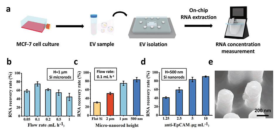 图4.a)分离效率测量过程示意图。b)在0.05-1mL/h的流速下,微棒基板(H=1μm)的分离性能。c)在0.1mL/h的流速下,平面硅基板和纳米棒基板(H=2、1和500nm)的分离性能。d)在1.25-10μg/mL的抗EpCAM浓度下,纳米棒基底(H=500nm)的分离性能。数据以三次独立测定的平均值±标准差表示。e)纳米棒侧壁上的EV的SEM图像。