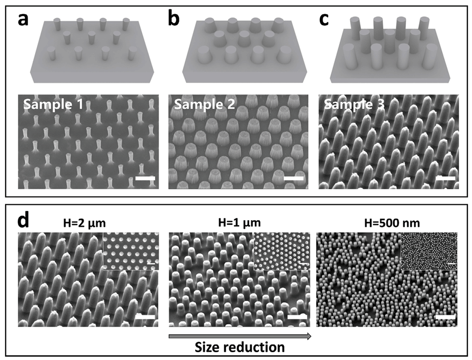 图3.a-c)样品1、2和3的SEM图像。d)根据样品3的参数制备的尺寸减小的纳米棒。比例尺,2μm。