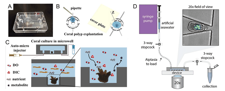 图3.用于培养和操纵珊瑚和海葵物种的微流控工具。