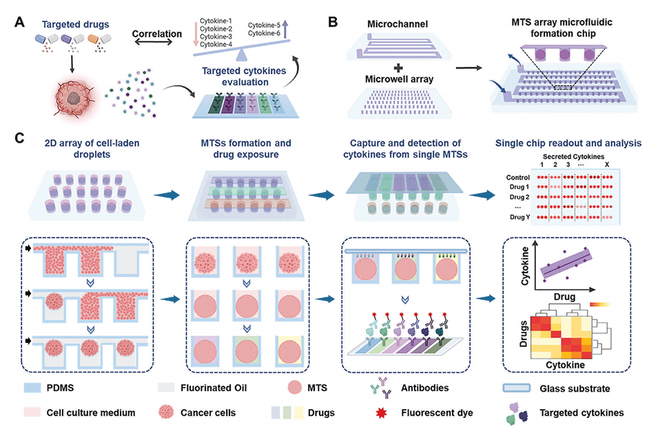 图1.多细胞肿瘤球体(MTS)的形成、药物治疗和细胞因子测量示意图。