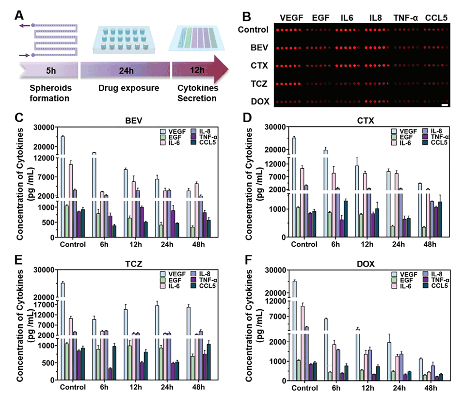 1、本研究开发了一种集成了多功能模块的微流控平台,可以实现均一的多细胞肿瘤球的快速生成、药物处理和单个肿瘤球分泌细胞因子的检测。