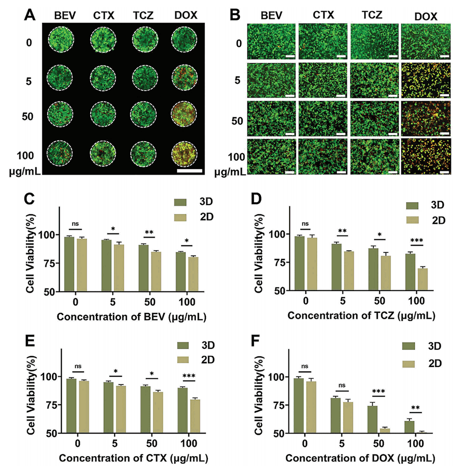 图3.三维和二维模型中MDA-MB-231细胞对药物治疗的敏感性。
