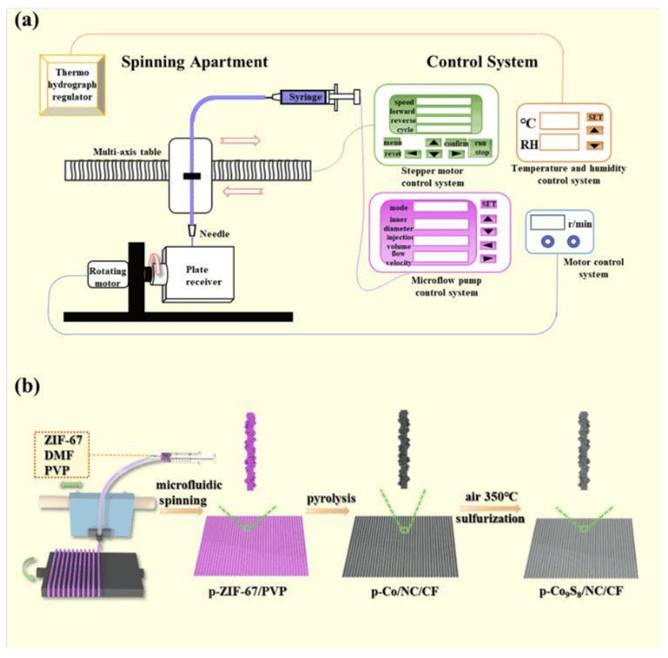 图1.(a)微流控纺丝装置的结构图,包括纺丝单元(左)和控制系统(右),(b)p-Co9S8/NC/CF合成示意图。