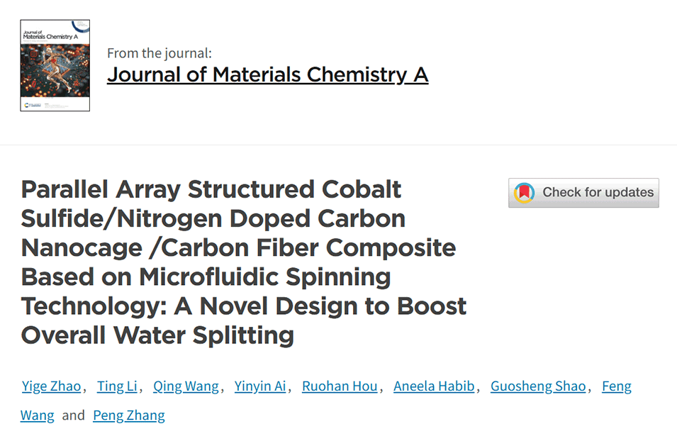 构建过渡金属基电催化剂的阵列结构是提高整体水分解性能的有效方法。然而,与传统的无序阵列结构相比,过渡金属基材料有序排列的平行阵列结构却鲜有报道。近期,北京化工大学王峰教授团队与郑州大学张鹏教授团队合作,通过微流控纺丝技术制备了具有平行阵列结构的Co9S8/氮掺杂碳纳米笼/碳纤维(p-Co9S8/NC/CF)复合电催化剂,该催化剂在整体水分解反应中表现出优异的双功能催化活性和稳定性,为开发高效的能源转换材料提供了新策略。相关研究以“Parallel Array Structured Cobalt Sulfide/Nitrogen Doped Carbon Nanocage /Carbon Fiber Composite Based on Microfluidic Spinning Technology: A Novel Design to Boost Overall Water Splitting”为题目,发表在期刊《Journal of Materials Chemistry A》上。