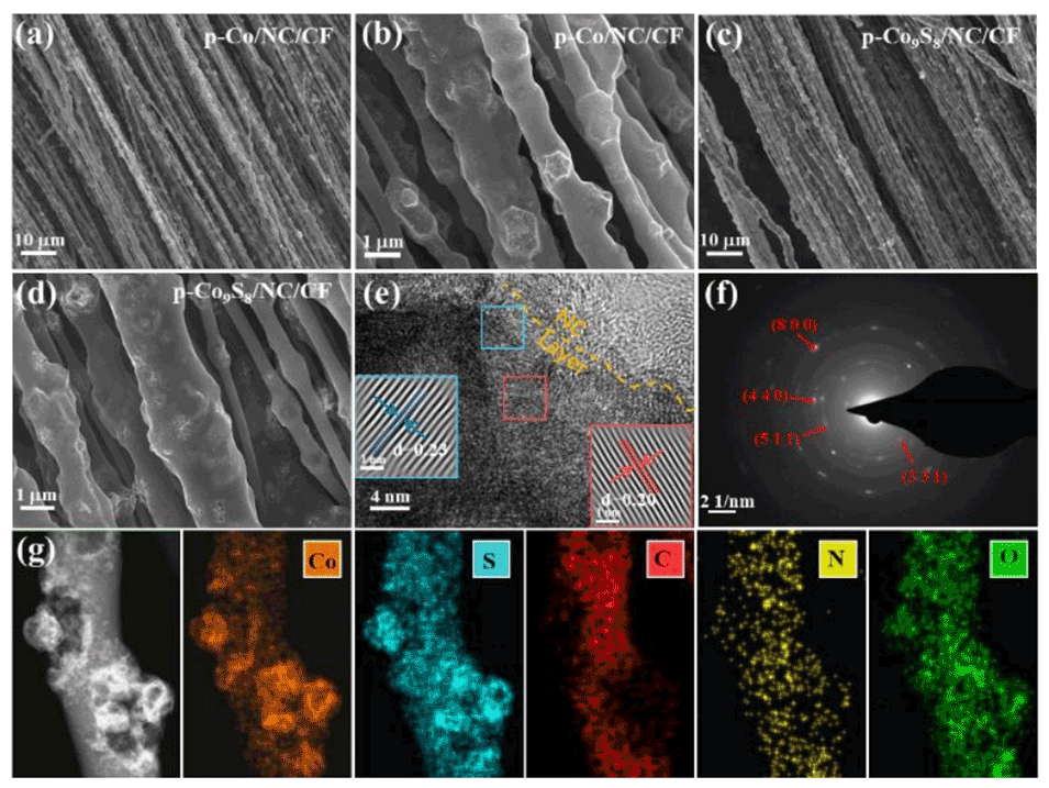 图2.(a-b)p-Co/NC/CF的扫描电镜(SEM)图像,(c-d)p-Co9S8/NC/CF的SEM图像,(e)TEM图像,(f)SAED图像,(g)元素映射图像。