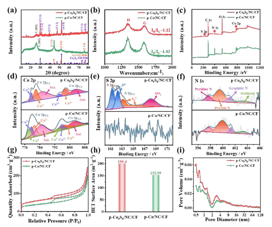 图3.(a)XRD图谱,(b)拉曼光谱,(c)XPS全扫描光谱,(d)Co 2p,(e)S 2p,(f)N 1s高分辨率XPS光谱,(g)N2吸附/解吸等温线,(h)BET表面积,(i)孔径分布。