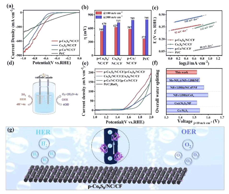 图6.(a)HER的LSV曲线,(b)相应的过电位,(c)塔菲尔图,(d)用于整体水分解的电解槽示意图,(e)水分解极化曲线,(f)p-Co9S8/NC/CF与报告的催化剂在10 mA·cm-2下的电池电压比较,(g)p-Co9S8/NC/CF的整体水分解示意图。
