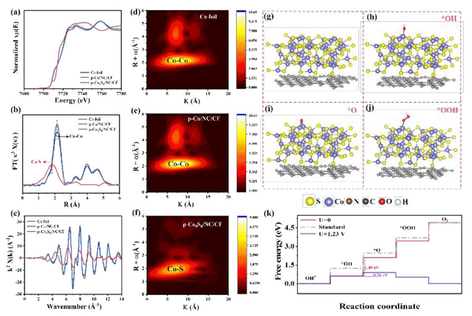 图5.(a)Co K边XANES光谱,(b)R空间中的Co K边EXAFS,(c)K空间中的Co K边EXIFS,(d-f)Co箔、p-Co/NC/CF和p-Co9S8/NC/CF的Co K边缘EXAFS光谱的小波变换等高线图。(g-j)p-Co9S8/NC/CF催化剂表面上OER中间体(*OH、*O和*OOH)优化配置的侧前视图。(k)p-Co9S8/NC/CF上OER的吉布斯自由能图。