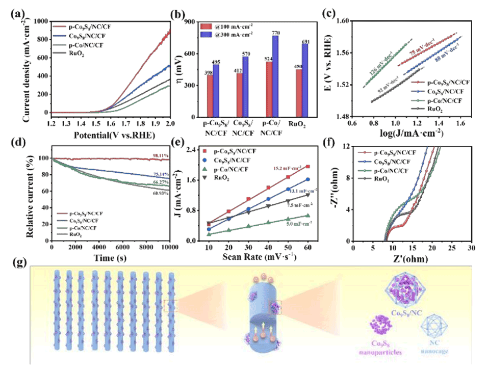 图4.(a)OER的LSV曲线,(b)相应的过电位,(c)塔菲尔图,(d)I–t计时电流曲线,(e)双层电容(Cdl)值,(f)奈奎斯特图。(g)平行阵列结构p-Co9S8/NC/CF的OER性能提高的原因示意图。