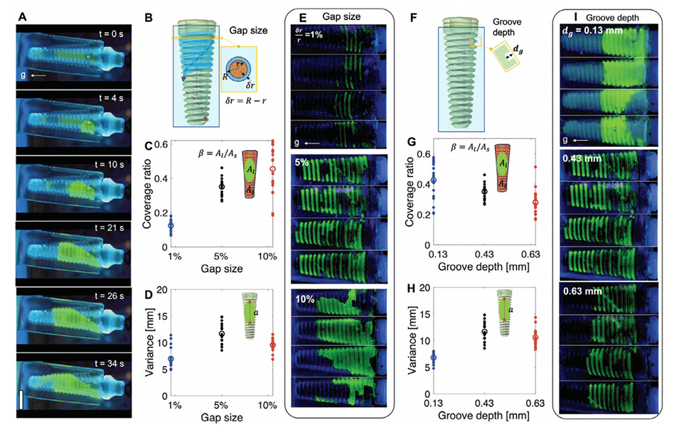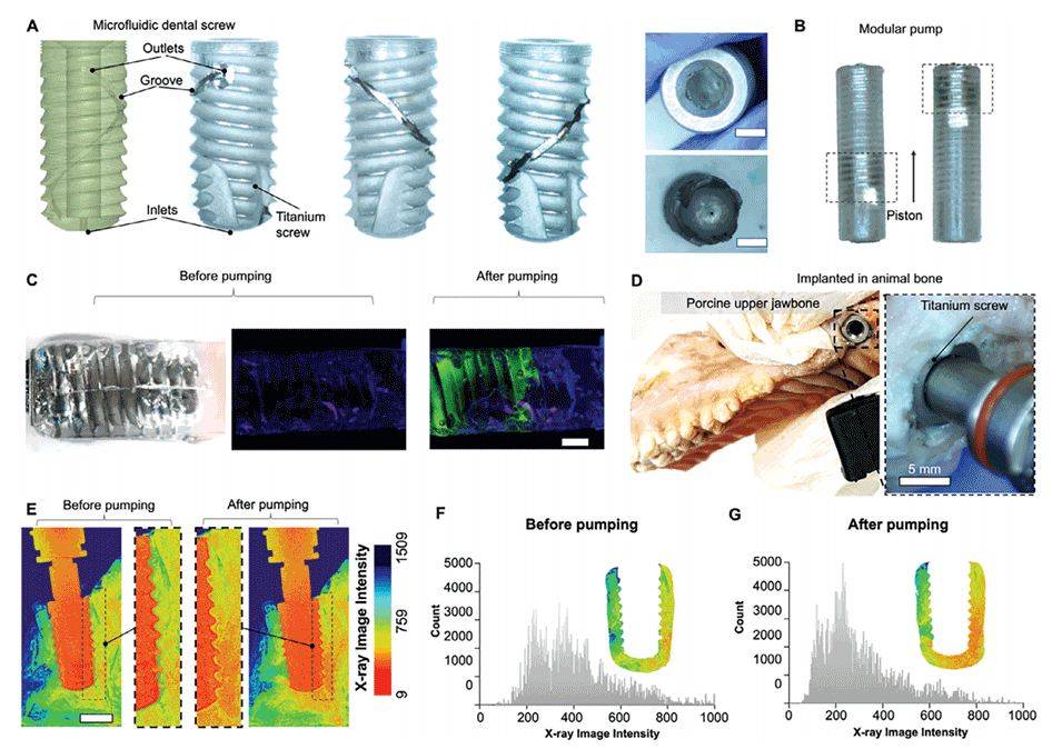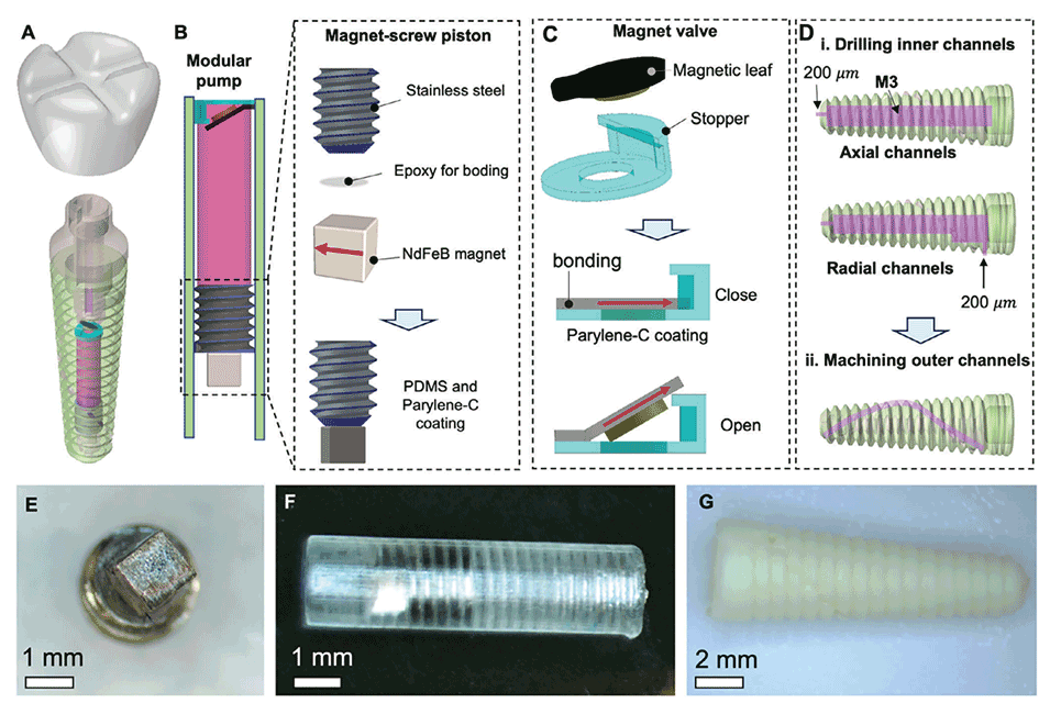 图2.集成流体通道、泵和阀的牙科植入物的设计和制造。