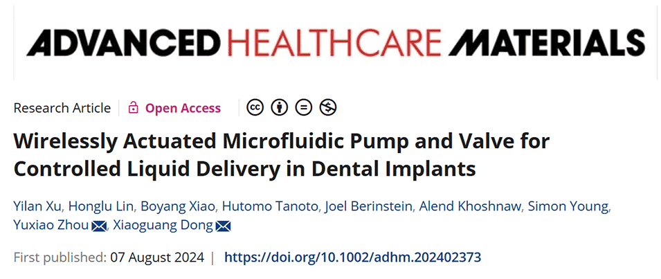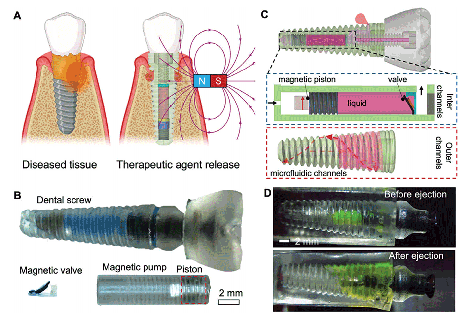 近期,美国范德堡大学(Vanderbilt University)董晓光教授团队研发了一种可通过外部磁场无线控制的微型泵和阀门系统,将该系统集成到牙科植入物中,能够实现精确且微创的液体药物释放,直接作用于植入物与骨界面,为预防生物膜形成、促进骨整合以及实现其他生物医学应用提供了一种新的治疗手段。相关研究以“Wirelessly Actuated Microfluidic Pump and Valve for Controlled Liquid Delivery in Dental Implants”为题目,发表在期刊《Advanced Healthcare Materials》上。