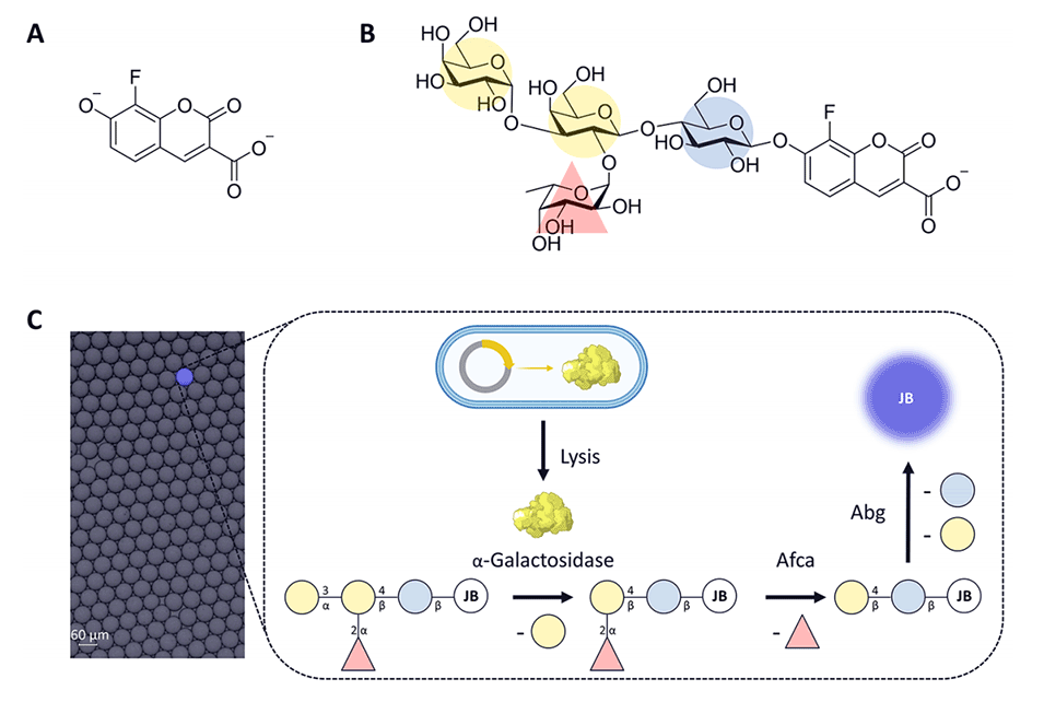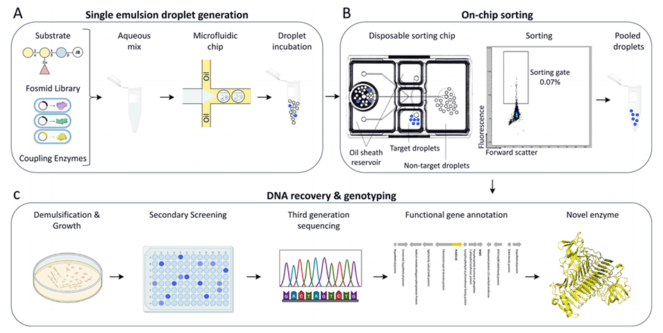 2、该系统将来自人肠道宏基因组文库的单细胞与含有荧光基团的B型抗原四糖基质一同封装在微滴中,利用商用微流控细胞分选仪对含有活性酶的荧光微滴进行分选。
