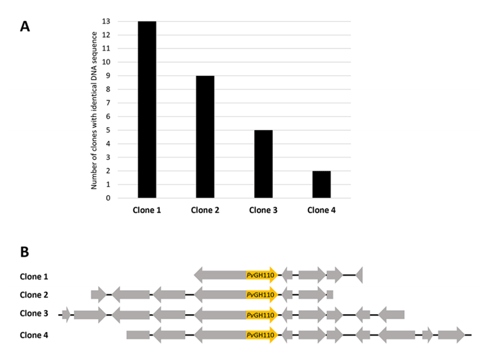 图3.展示了液滴微流控筛选结果:鉴定出四个不同的插入片段,编码来自Phocaeicola vulgatus的独特α-半乳糖苷酶(PvGH110)。