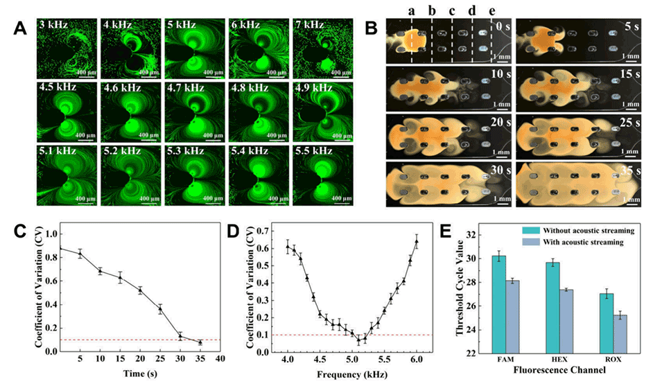 4、共振频率的应用:通过确定气泡的共振频率并应用此频率激发气泡振荡,可以产生显著的声流现象,从而实现磁珠的高效混合。