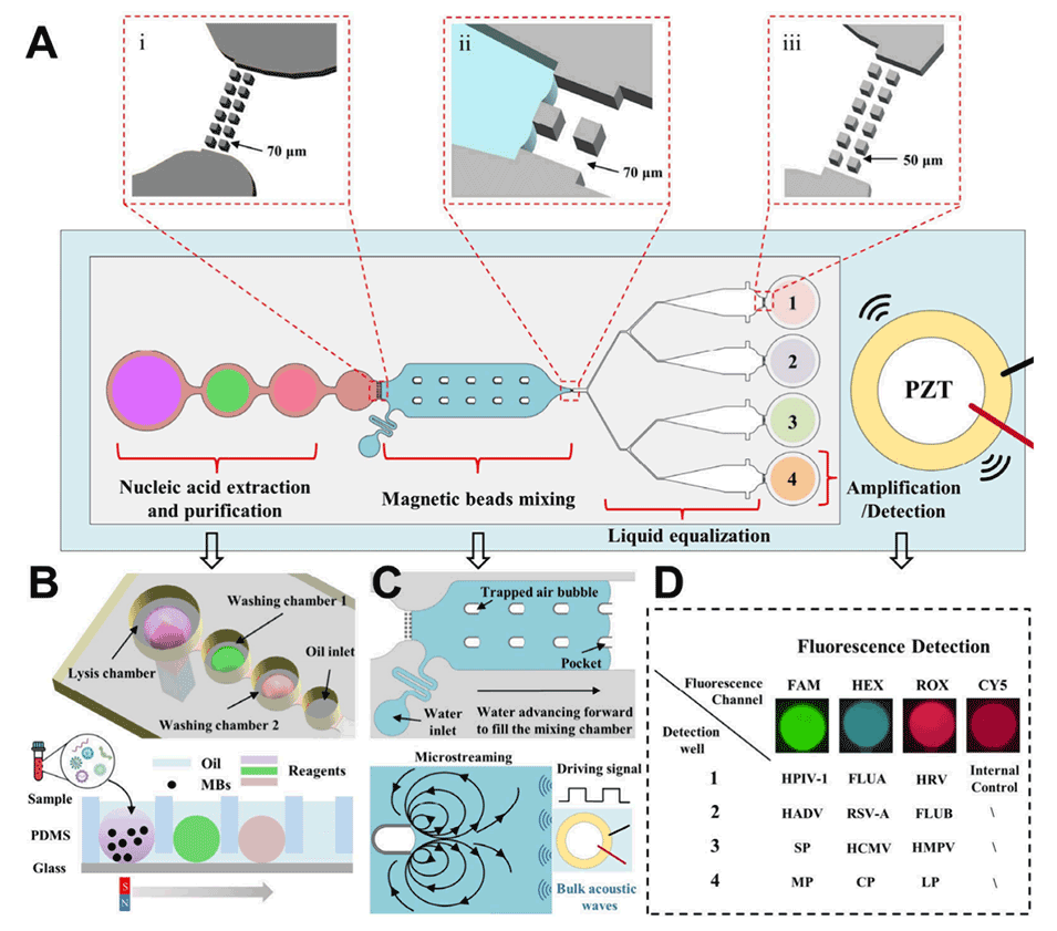 图1.用于同时检测多种呼吸道病原体的集成微流控芯片。