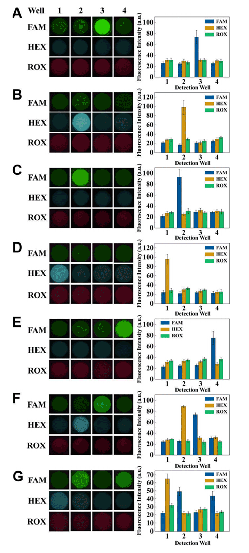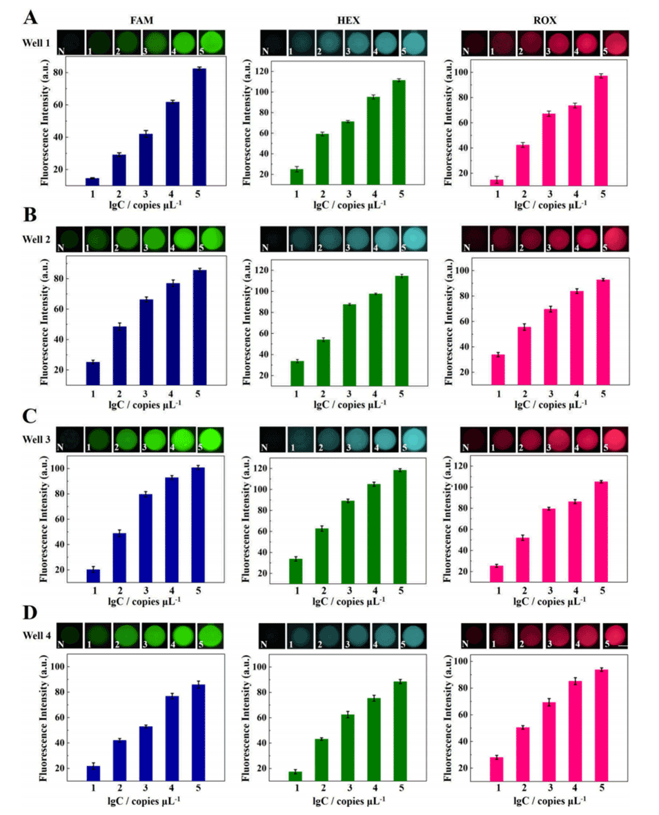 图4.使用荧光显微镜读取FAM、HEX和ROX通道的片上荧光结果。图A、B、C和D分别对应1、2、3和4号孔。误差条表示至少3次重复实验的标准偏差。