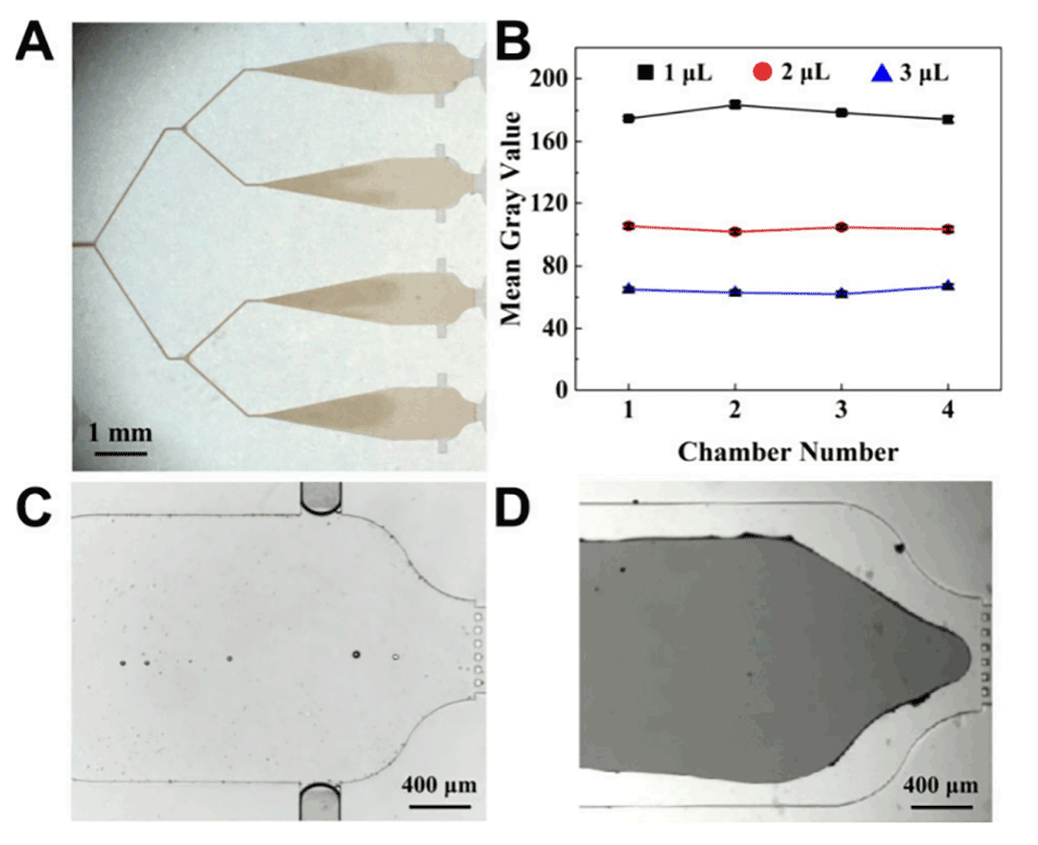 图3.(A)磁珠被油相推入等分腔室的图像。(B)不同体积的磁珠在四个腔室中的平均灰度值。(C)在有两个矩形腔室和(D)没有两个矩形腔室的情况下,磁珠在等分腔室中的残留情况。
