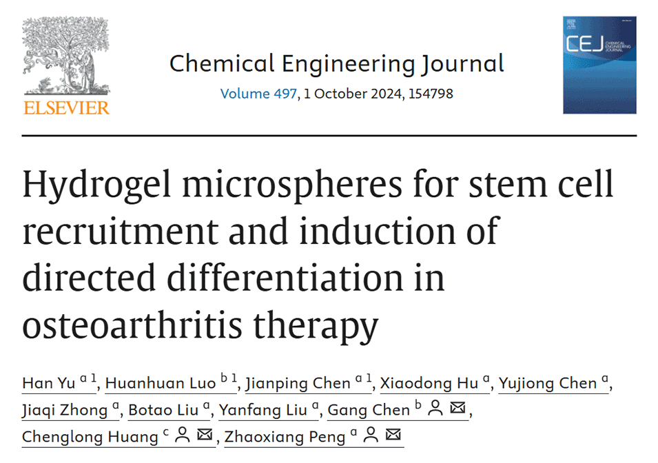 近期,宁波大学彭兆祥团队与华中农业大学黄成龙团队合作,开发了一种新型生物活性水凝胶微球(MDGM-Ps),通过精确释放镁离子和血小板衍生生长因子-BB,有效招募干细胞并诱导其向软骨细胞定向分化,以治疗骨关节炎。相关研究以“Hydrogel microspheres for stem cell recruitment and induction of directed differentiation in osteoarthritis therapy”为题目,发表在期刊《Chemical Engineering Journal》上。