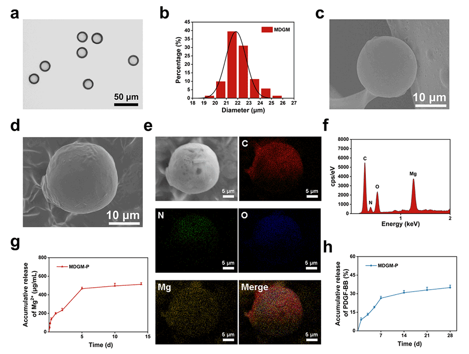 2、利用微流控技术制备了Mg2+负载的生物活性水凝胶微球(MDGMs),并通过共孵育将血小板源性生长因子BB(PDGF-BB)负载到MDGMs上,形成PDGF-BB和Mg2+共负载的水凝胶微球(MDGM-Ps)。