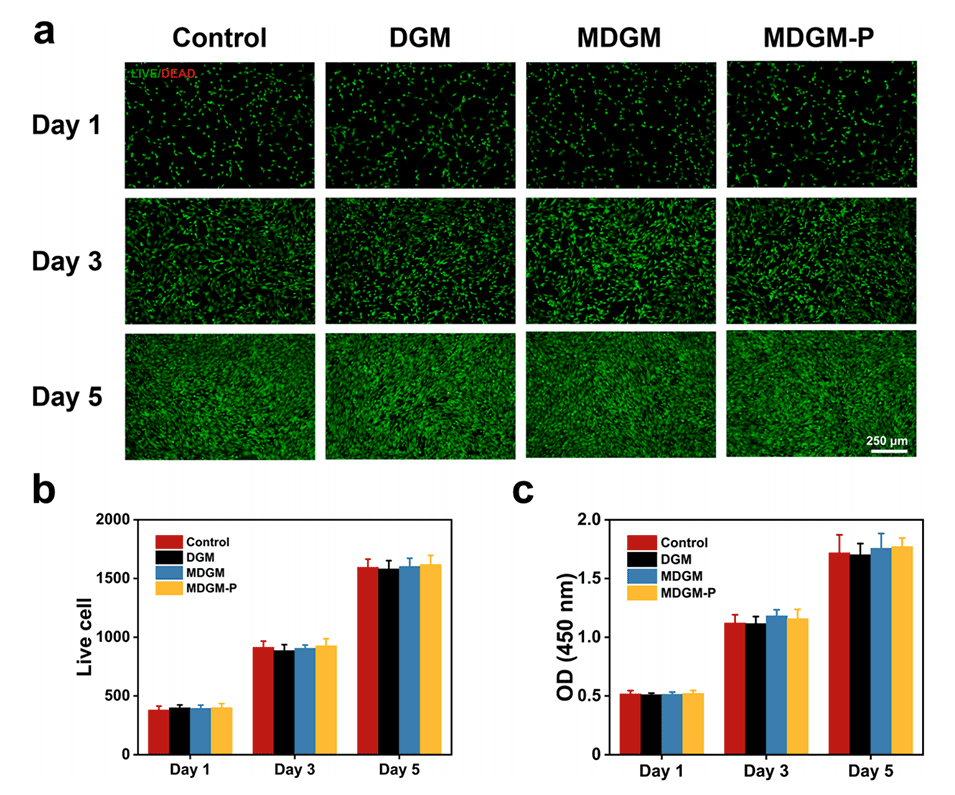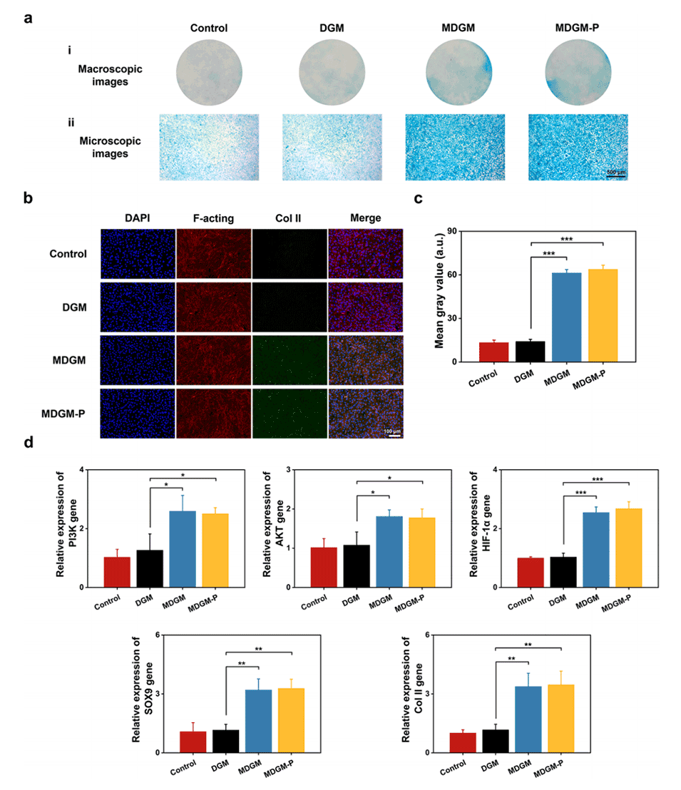 3、MDGM-Ps表现出良好的生物相容性,能有效促进干细胞迁移和趋化,并通过PI3K-AKT-HIF-1α信号通路诱导干细胞向软骨细胞分化。