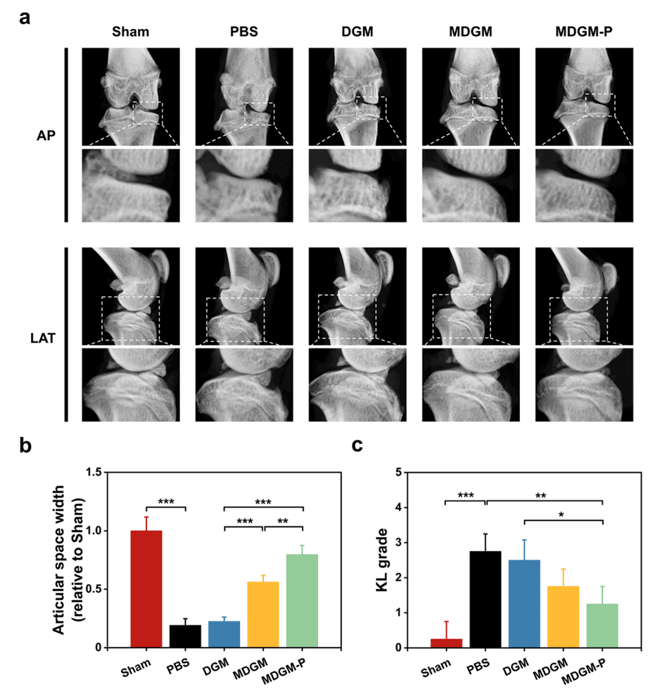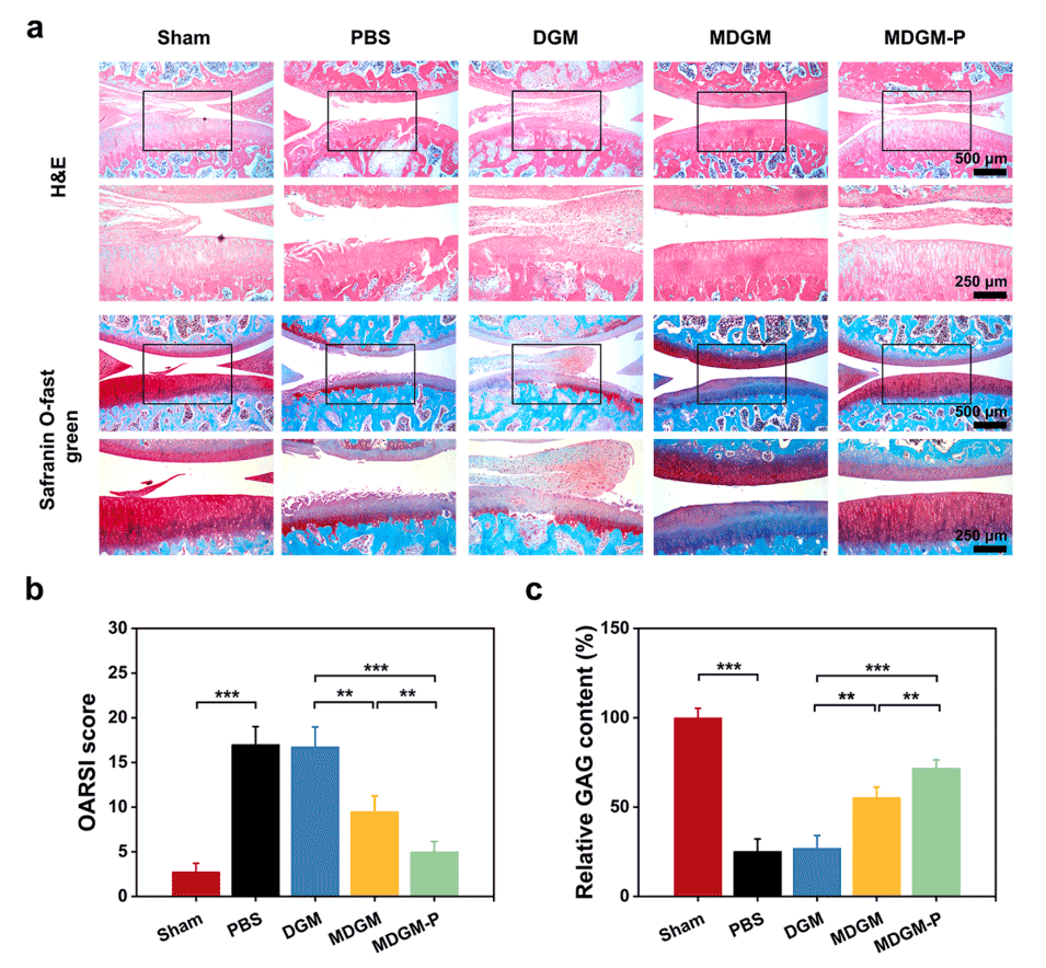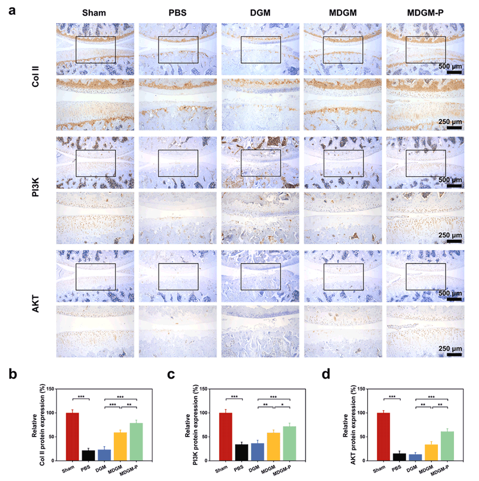 4、体内实验表明,MDGM-Ps能够维持关节软骨基质,减缓骨关节炎的进展,其治疗机制也与PI3K-AKT信号通路的调节有关。