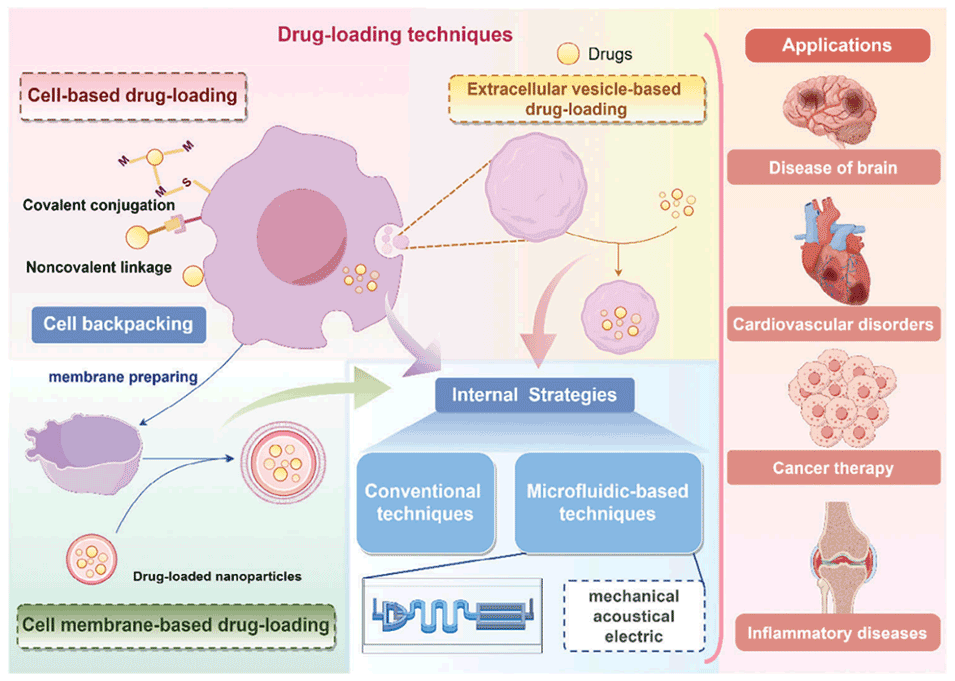 传统的药物递送技术面临着与靶向性和不良反应相关的挑战。近年来,基于纳米粒子的药物载体取得了重大进展。然而,人们对其安全性和代谢不足的担忧依然存在。采用细胞及其衍生物(如细胞膜和细胞外囊泡(EVs))作为药物载体可有效解决与纳米颗粒载体相关的难题。然而,将药物有效地装载到这些载体中仍然是一个重要障碍。微流控技术具有微纳米尺度上的精确操控能力,且样本损失极少,在利用细胞及其衍生物装载药物方面得到了广泛应用,从而促进了载药技术的发展。