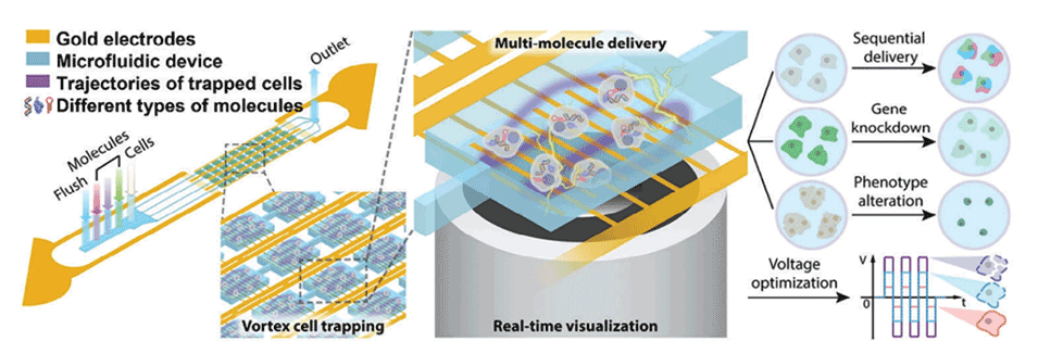 图2.μSEA(微尺度对称电穿孔器阵列)装置和多分子递送应用说明。