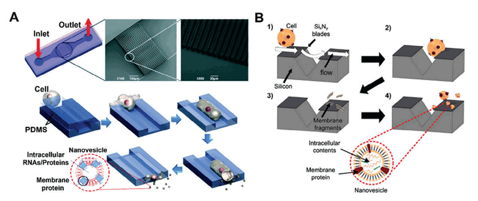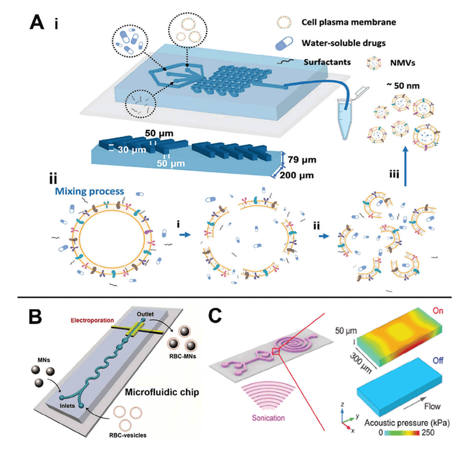 图6.早期基于微流体的细胞膜药物装载策略中产生纳米囊泡的过程。